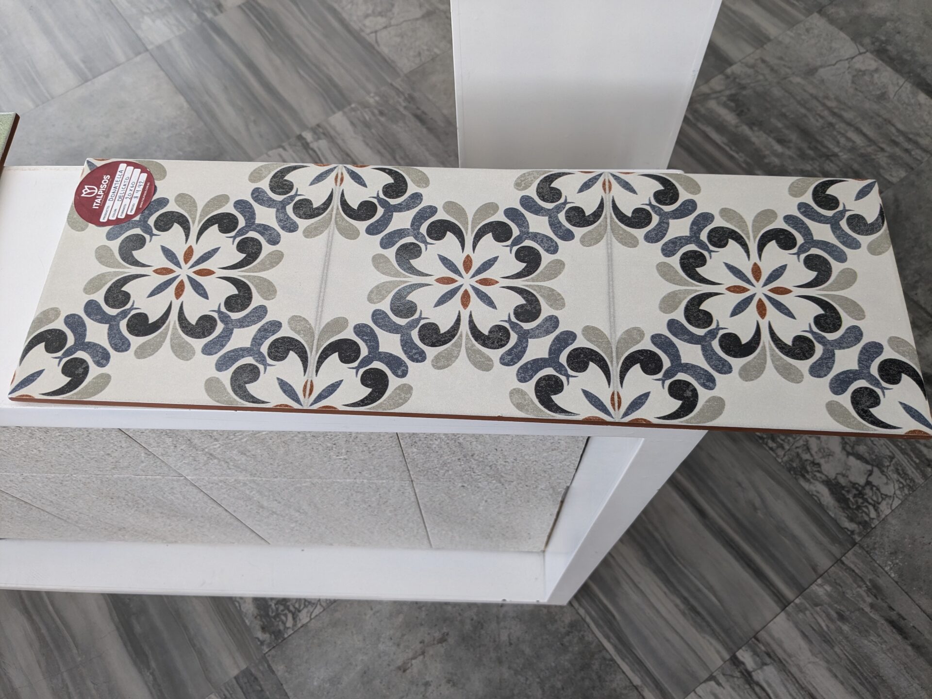 And finally, we have the decorative tile for the backsplash of the kitchen. This will be run in two rows between the countertop and cabinets with another grey tile in between that is not pictured.