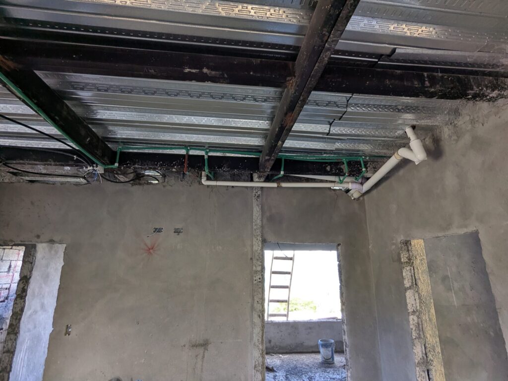 All of the second-story water and drainage needs are concentrated on one side of the house, which made the runs straightforward and relatively short. In the photo, you can see the white drainage lines and green water lines emerging from the second-story floor, running just beneath the metal framing. The water lines will eventually connect to the supply line outside the house, while the drainage pipes are set at a slight downward angle to tie into the main black and grey drainage lines. Those were embedded during the pouring of the pad and are now concealed within the first-floor walls. And, after this work is complete, all of the lines will be hidden by the installation of a gypsum ceiling.