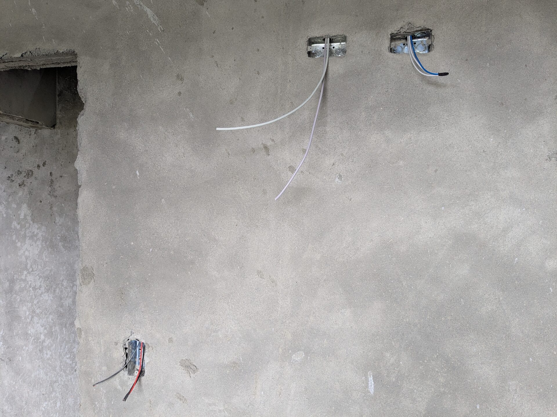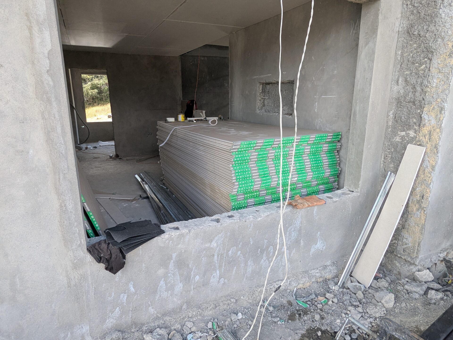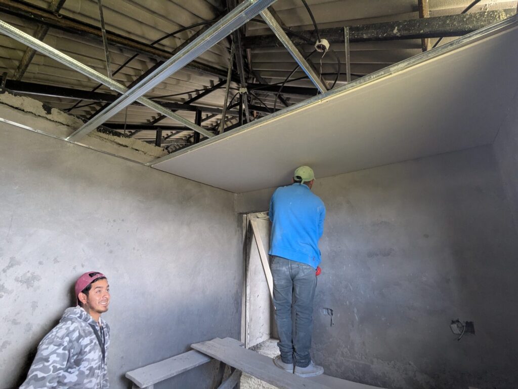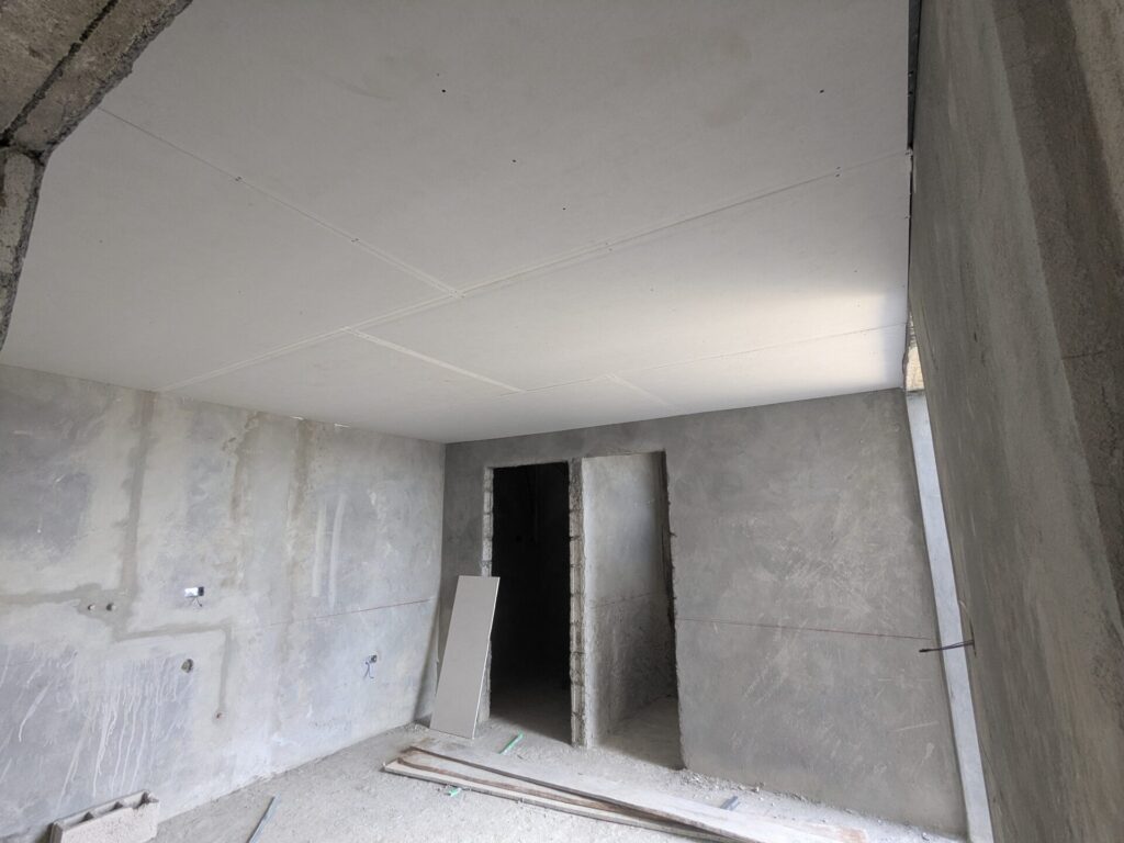 As this transition nears, many elements have already reached their rough-in stage and now wait to receive their final touches. In this post, I want to capture what these components look like before they disappear beneath the finishing work. Electrical and internet cabling, water lines, templating the stairs, and most recently, the installation of the drywall ceiling have all been completed or are nearing completion. With that, let’s take a look at each of these items, starting with the ever-familiar enlucido.
