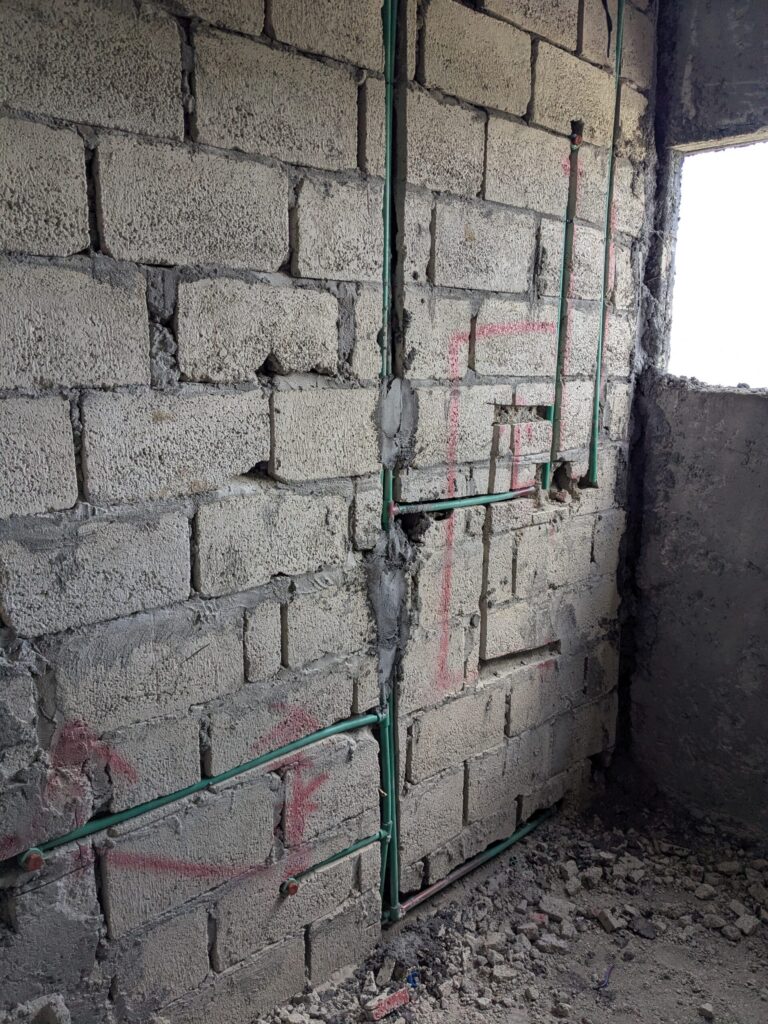All of the interior water lines are now complete. The system uses 20 mm (0.78 in) PPR tubing with an internal diameter of about 14 mm (0.55 in), joined by heat‑fusion connections for durability. In total, the inside of the house contains 21 cold‑water outlets and 14 hot‑water outlets. To balance demand, the hot‑water lines are divided between two tankless heaters, one serving the kitchen, laundry, and guest bathrooms, and the other dedicated to the bathrooms of the family. The tubing runs through narrow channels cut into the concrete block walls, which will be secured and concealed beneath a layer of enlucido.