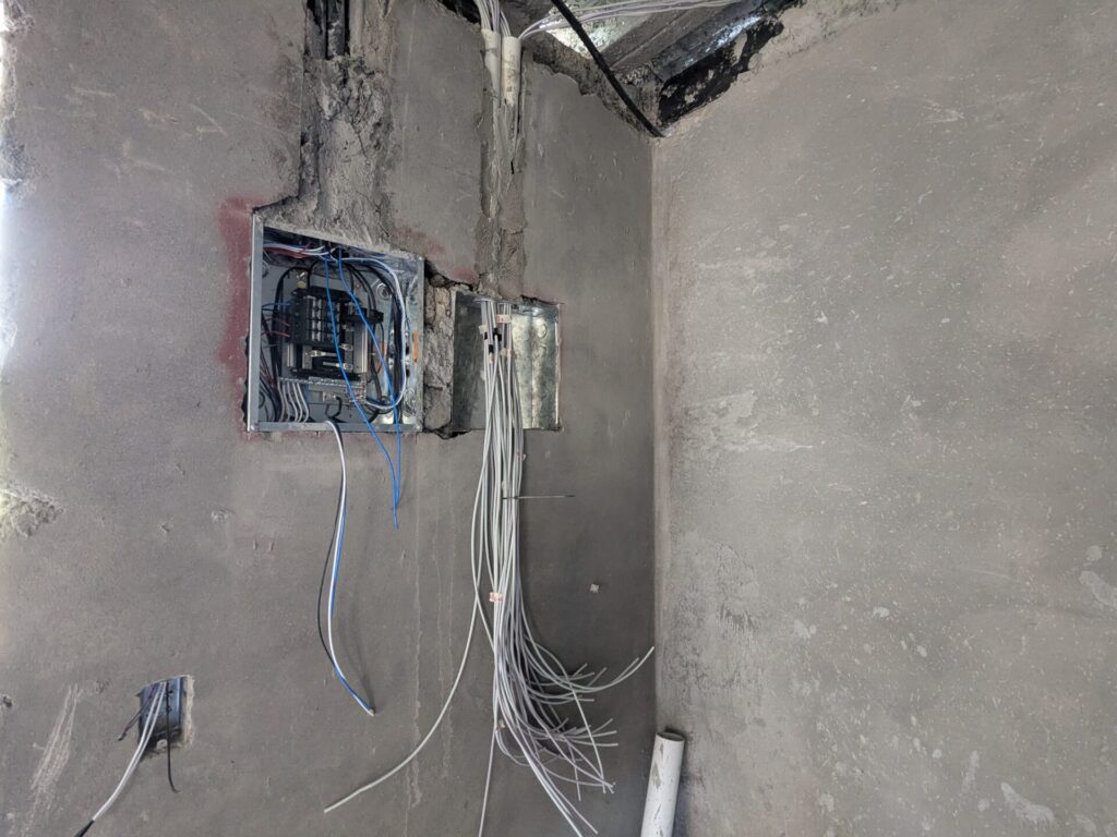 All of the power and networking lines converge here, in the foyer closet. The electrician has installed a standard electrical panel alongside a distribution box for the network cabling. Once the walls are fully finished, a server enclosure will be installed beneath the panels to house the equipment that supports the entire network. That equipment has already arrived, and I’m looking forward to sharing a future post about the installation process.