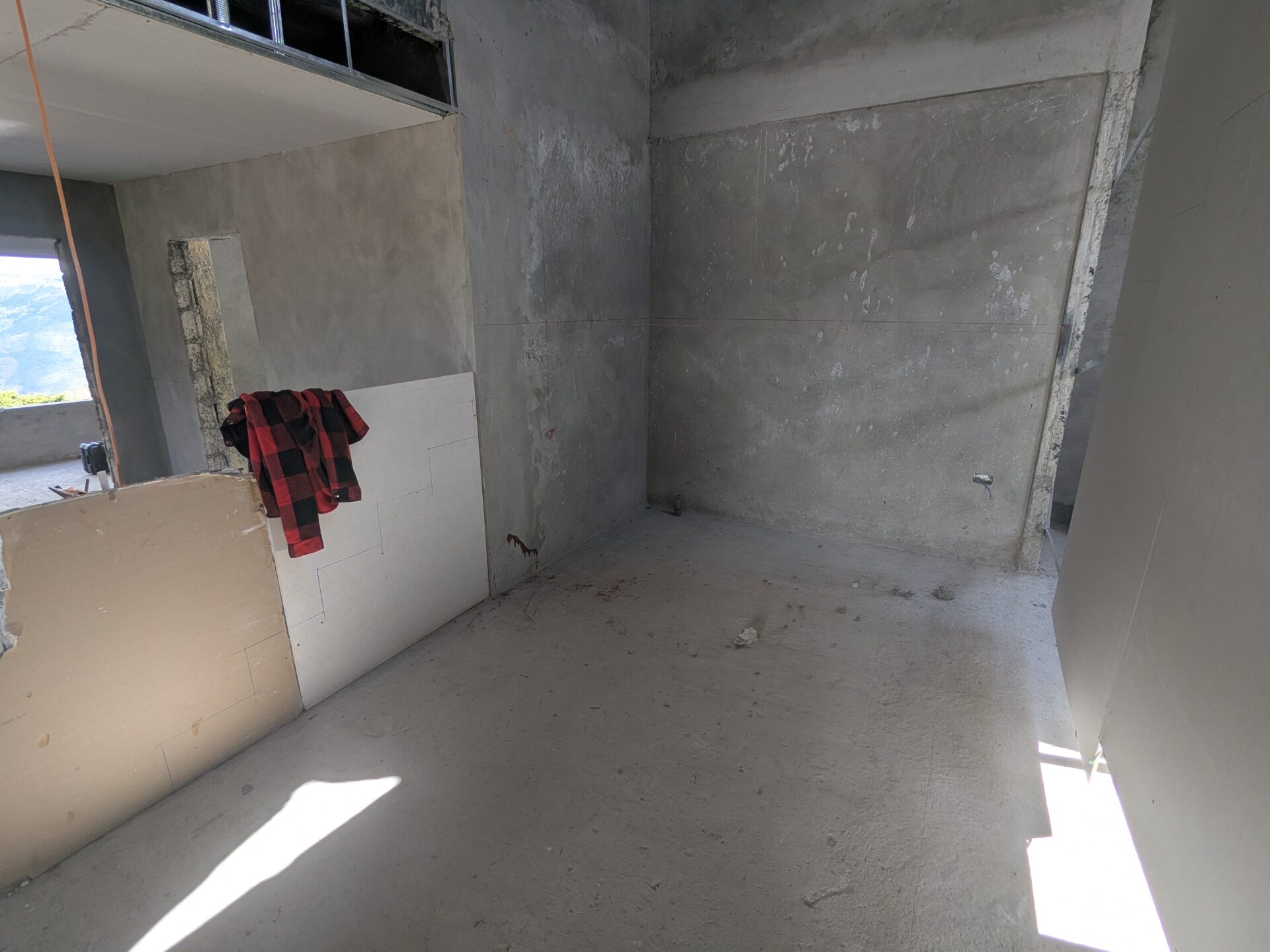 Now, a quick update on the stairs. I’ll save the full explanation of materials and design for when they’re installed, but for now I wanted to capture the very first step of the process. The carpenter has used sheets of drywall to map out the layout, and if you look closely at the back wall, you’ll notice a string line and marking at the level of the intermediate landing. That landing will guide the change in direction as the stairs rise to the second story. With a bit of luck, the installation of these stairs will be completed by year’s end.