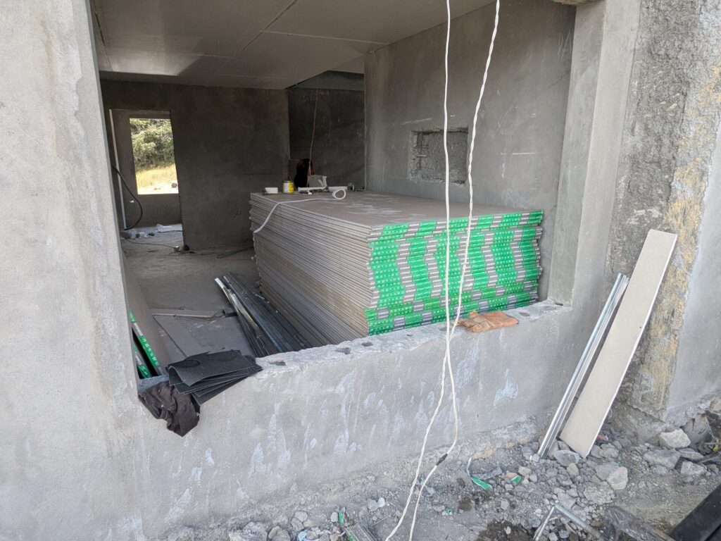 The final update on the house is drywall. All of the panels arrived earlier this week, and a couple of the workers have been busy installing them.
