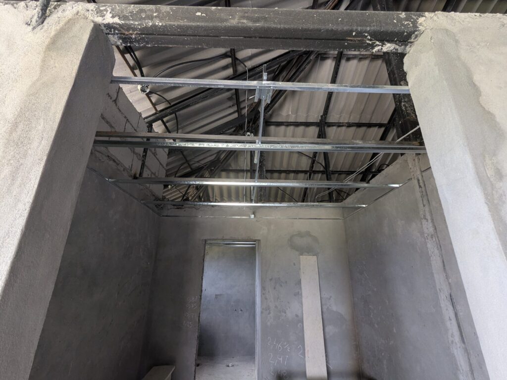 Installation begins with the aluminum support structure. First, a framing system is secured directly to the walls around the perimeter of the room. Next, metal furring is laid across the framing, creating the attachment points for the drywall. Once the furring is in place, additional reinforcement is added across the span. Vertical metal bracing ties into the existing steel framing of the house, ensuring the system can carry the weight of the drywall.